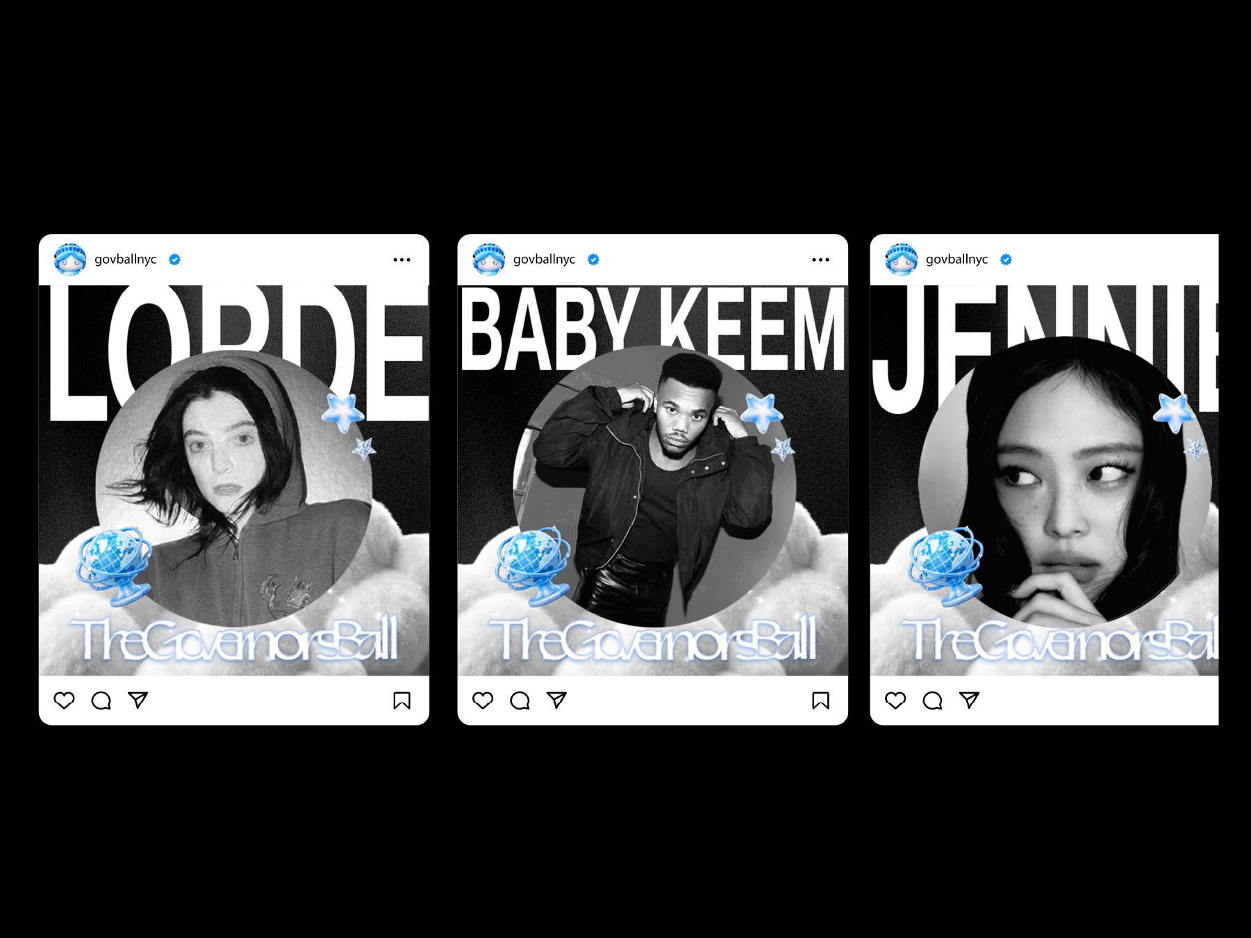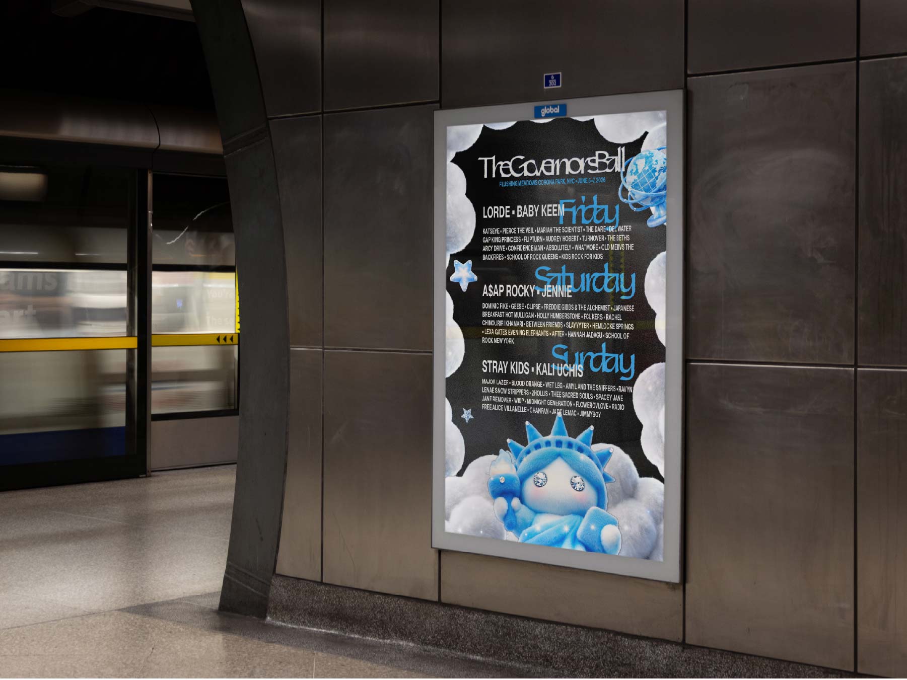 The Governors Ball branding project reimagines the festival’s identity through the lens of summer atmosphere, using a cool blue color palette to visually counteract the heat of the season and create a sense of freshness and relief. Blue functions not just as a color choice but as an emotional and sensory experience, evoking calmness within the high-energy environment of a music festival. Paired with this, soft, rounded 3D forms are used as core visual assets to express bubbiness, playfulness, and joy, reflecting the cheerful and communal spirit of the event. The inflated, tactile quality of these forms adds a sense of lightness and approachability, transforming the brand into an immersive, feel-good experience that balances intensity with ease.